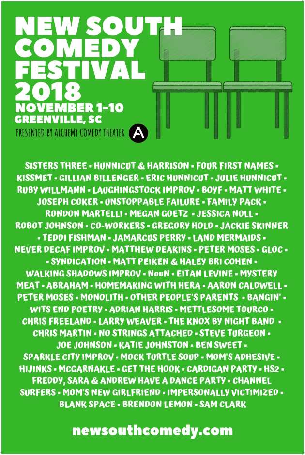 Then on our final Saturday afternoon of the festival there are 5 more workshops from guest instructors. Immediately following there are 4 more shows culminating in our Festival Finale at 10:30pm featuring scripted and unscripted material from NYC, Atlanta, Austin, LA, and right here in Greenville, SC.